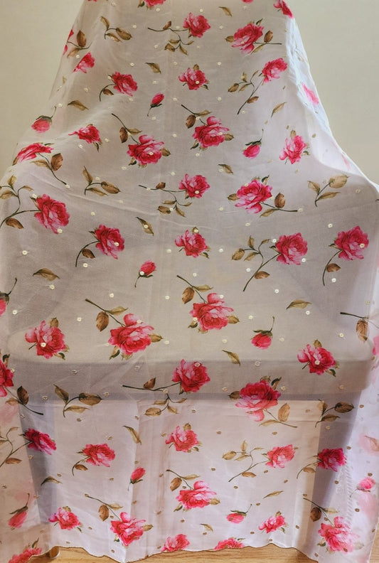 Cream/Offwhite Floral Organza Dupatta With Golden Border