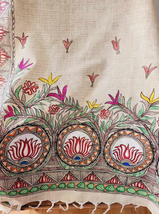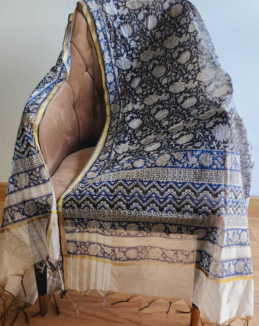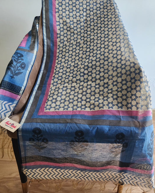 Beige & Blue Handblocked Dupatta In Chanderi Cotton