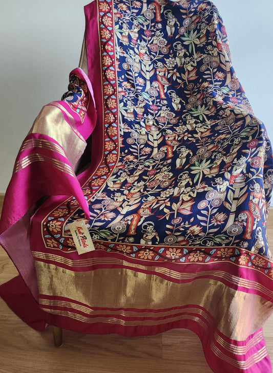 Blue Pichwai Print Dupatta With Dark Pink Zari Border In Modal
