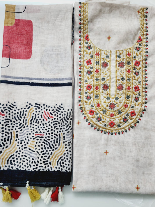 Beige Ivory Kota Suit With Lady Figure & Lotus Flowers, Knot Embroidery Kurta, Figure Print Dupatta & Solid Cotton Bottom
