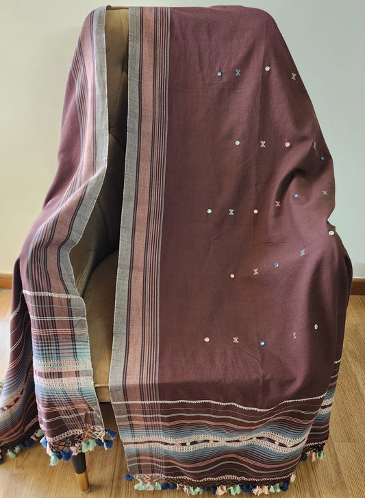 Brown Handwoven Bhujodi Dupatta With Tassles & Mirror Work
