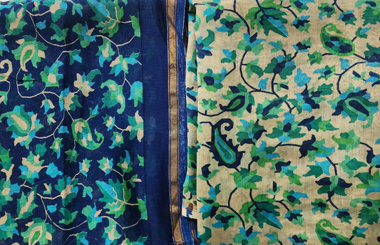Green & Blue Floral Handblocked Printed Pure Silk Dupatta