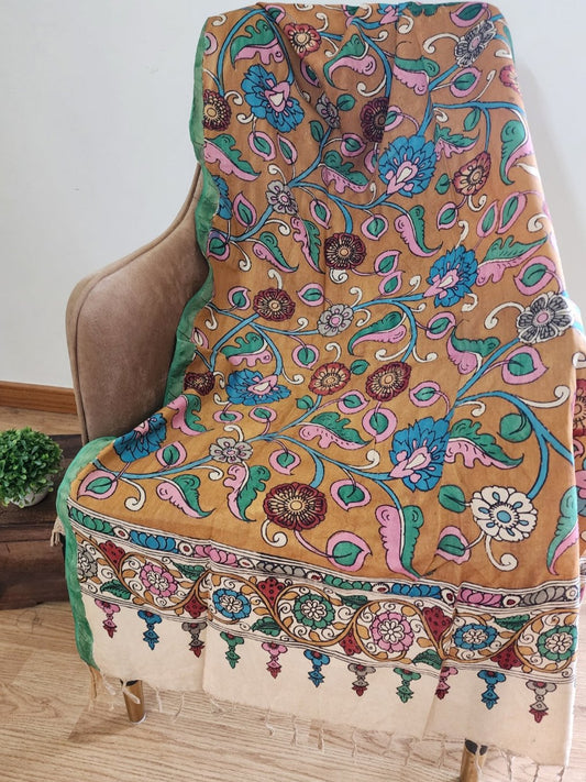 Green & Blue Floral Handblocked Printed Pure Silk Dupatta
