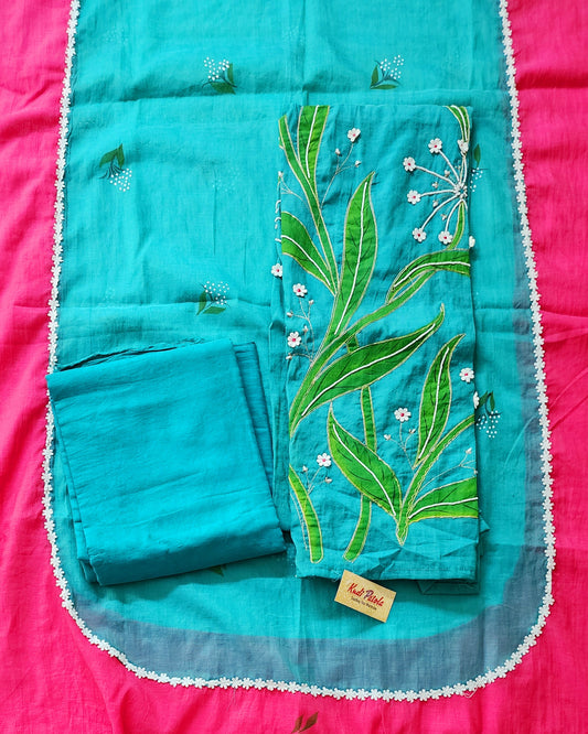 Teal Blue & Beige Muslin Kurta Set With Maheshwari Handblock Dupatta
