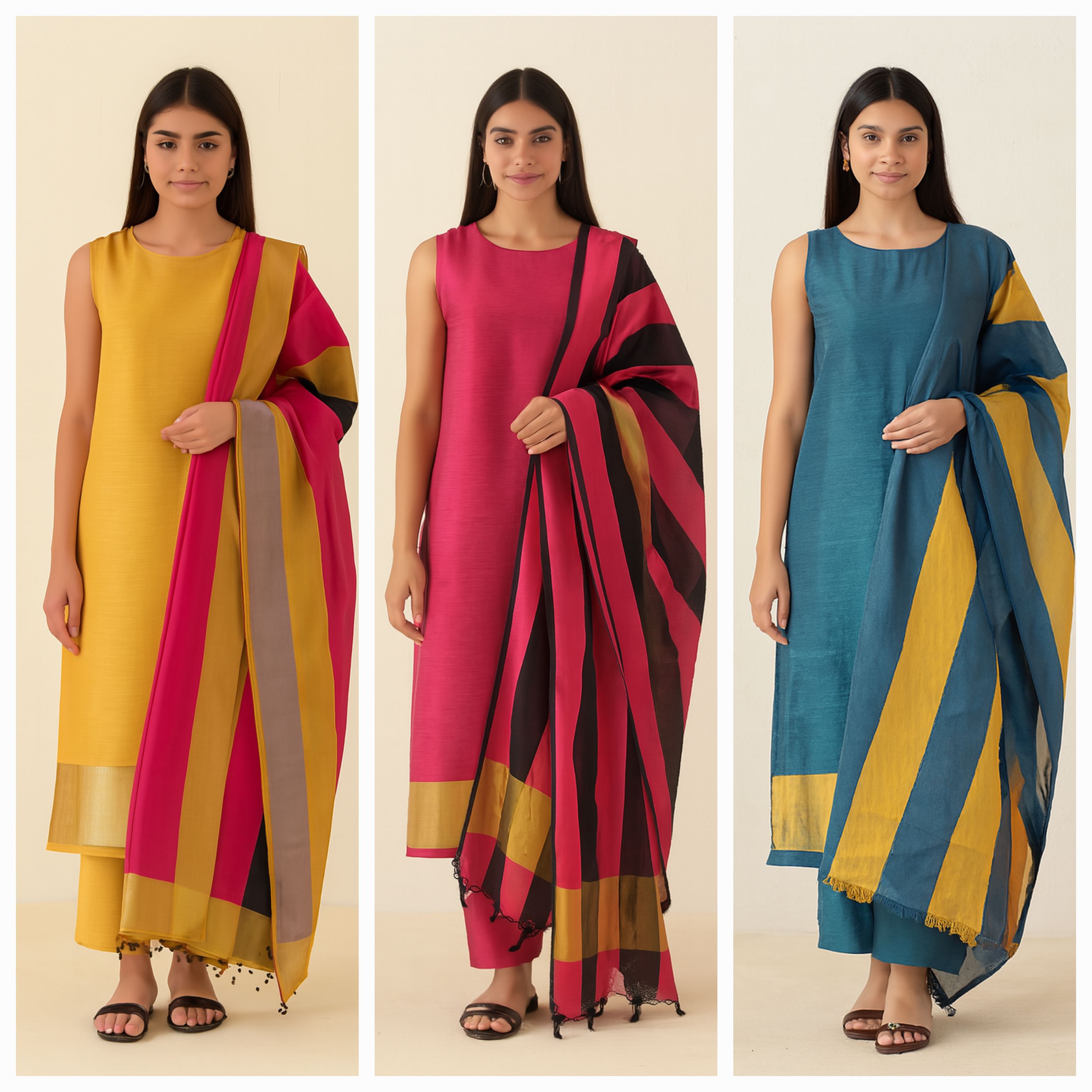 Handwoven in Kutch, Bhujodi dupattas blend earthy elegance with timeless craft