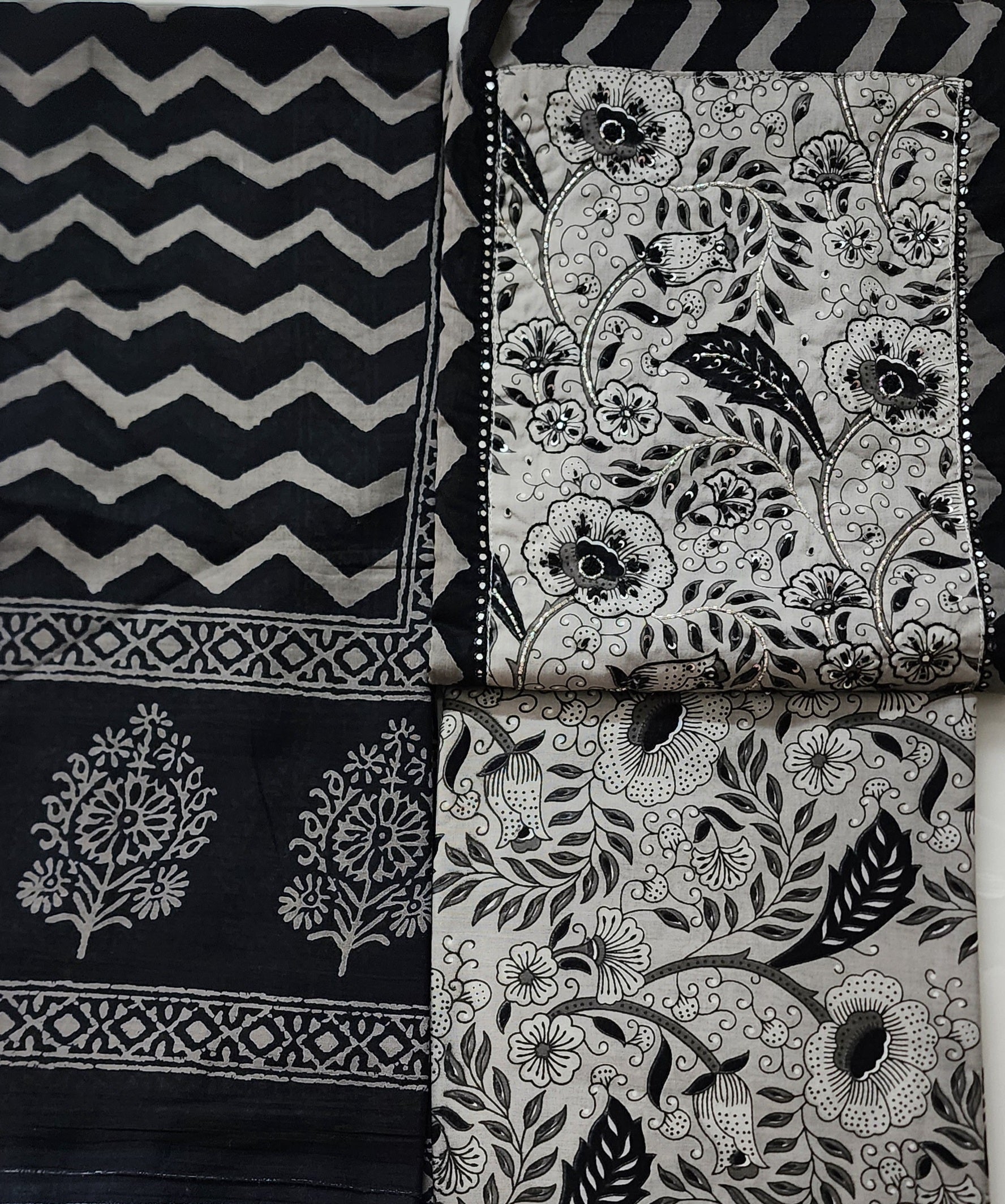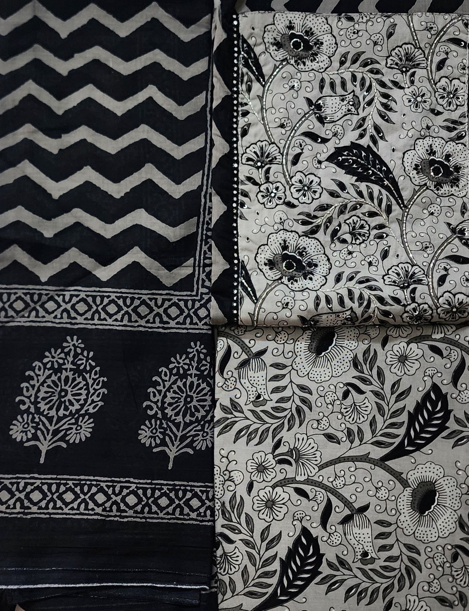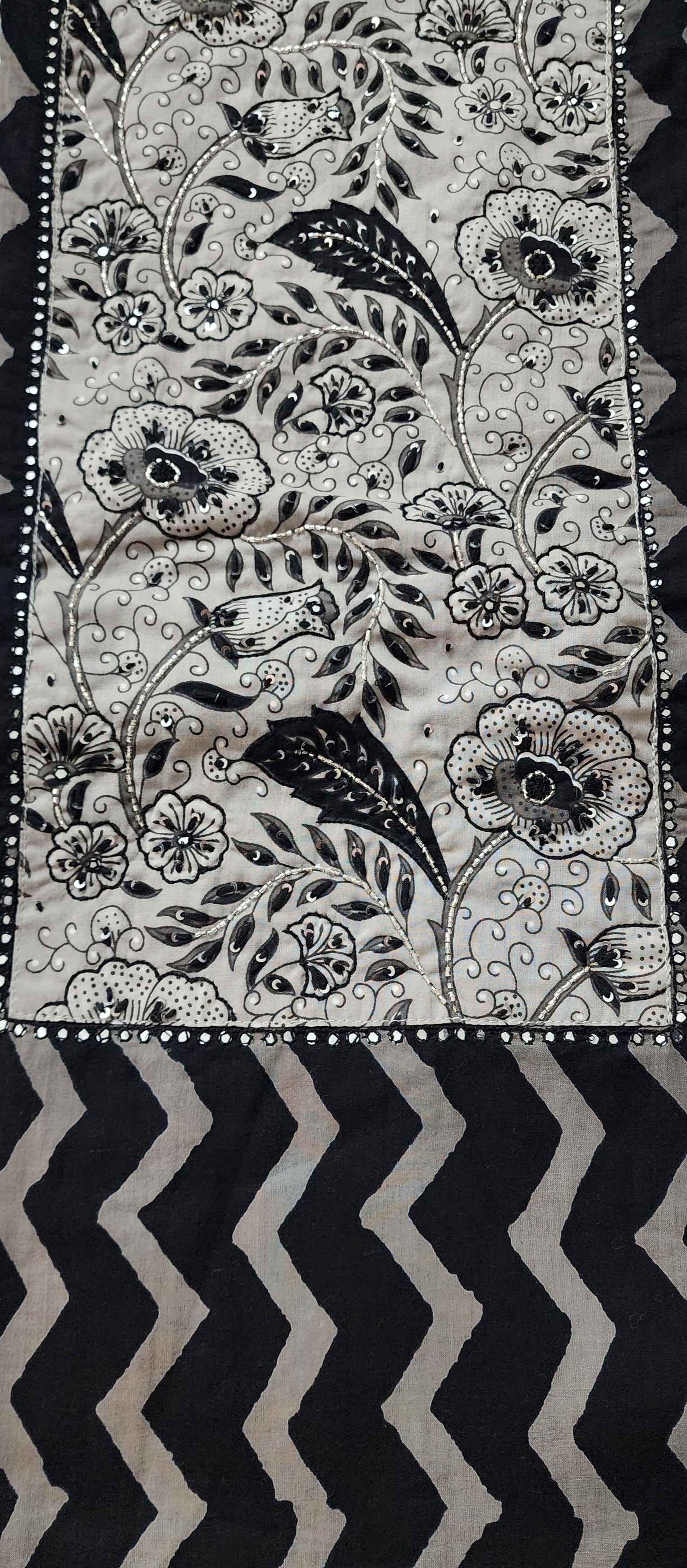 Black & Grey Cotton Printed Kurta With Embroidered Yoke And Mul Cotton Dupatta
