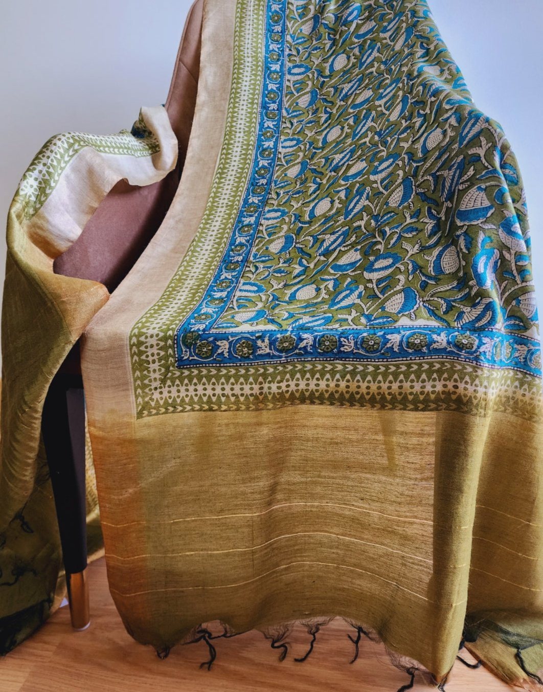 Green & Blue Floral Handblocked Printed Pure Silk Dupatta