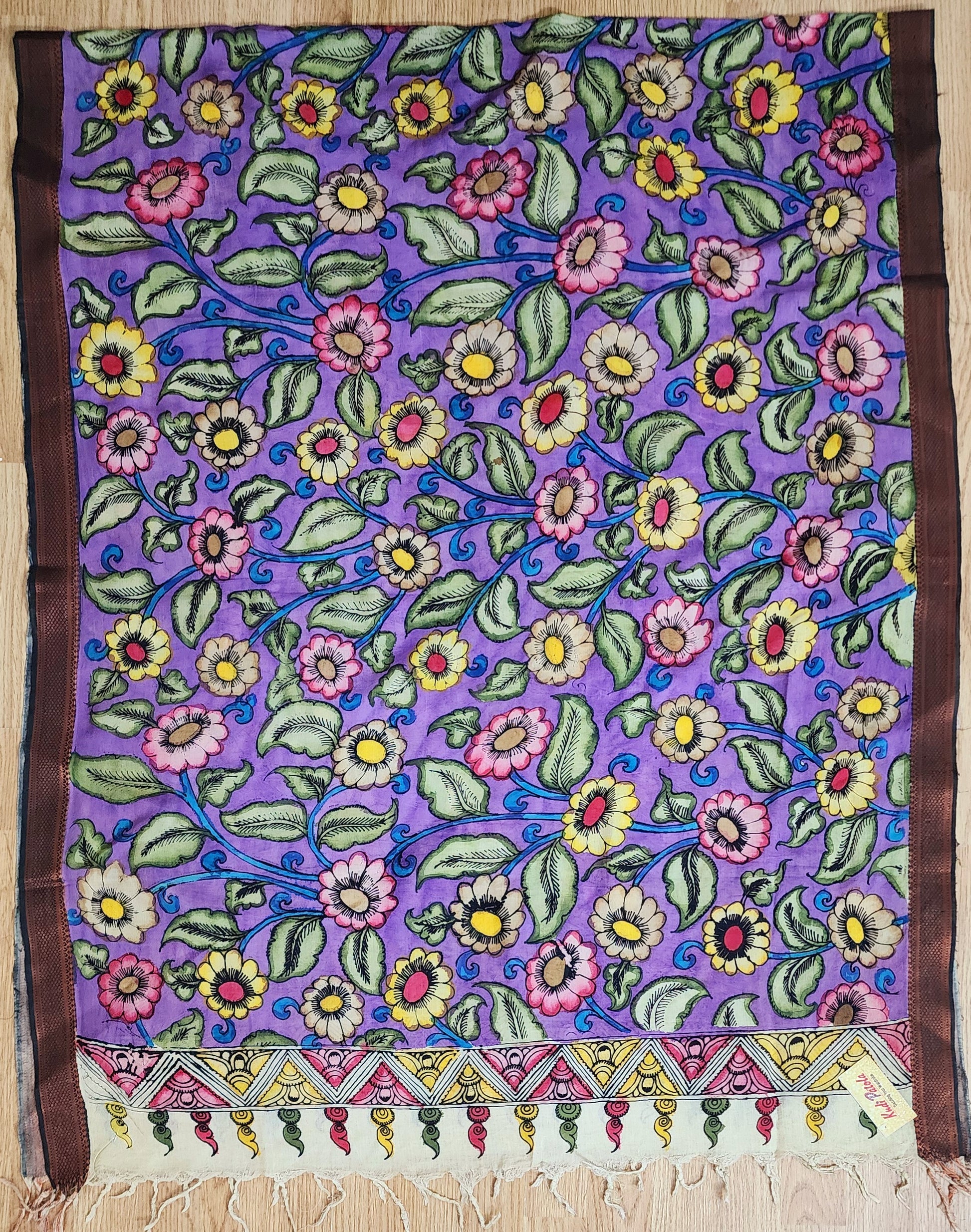 Purple Multi Colored Floral Hand painted Kalamkari Cotton Dupatta With Zari Border