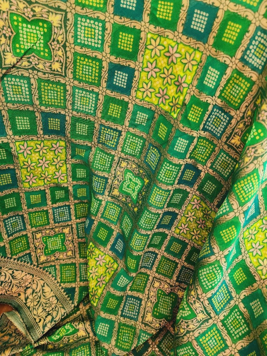 Design - Traditional Bandhani tie-dye technique with golden zari detailing, combining rich green shades with a luxurious touch of gold.