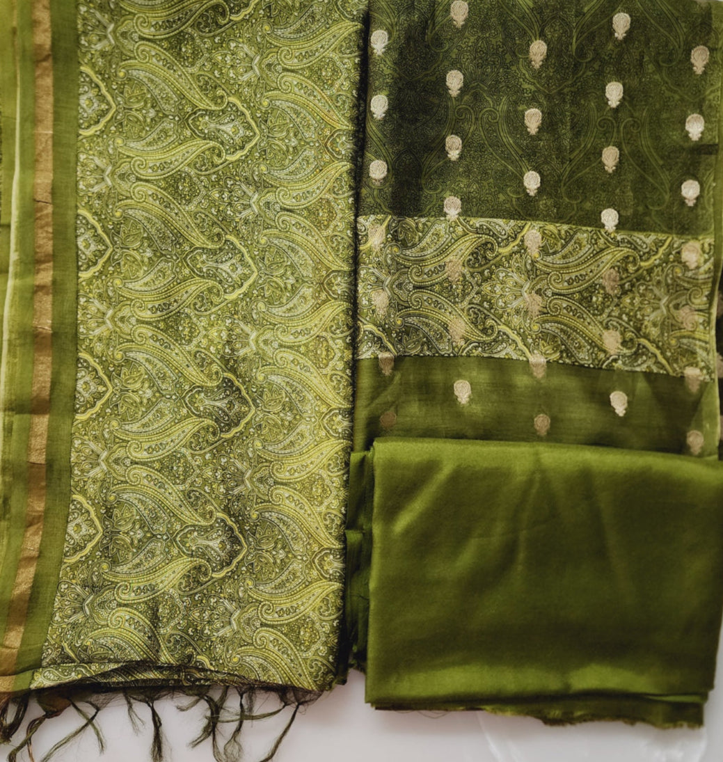 Green Munga Silk 3-Piece Kurta Set with Zari Buta – Elegant Traditional Wear