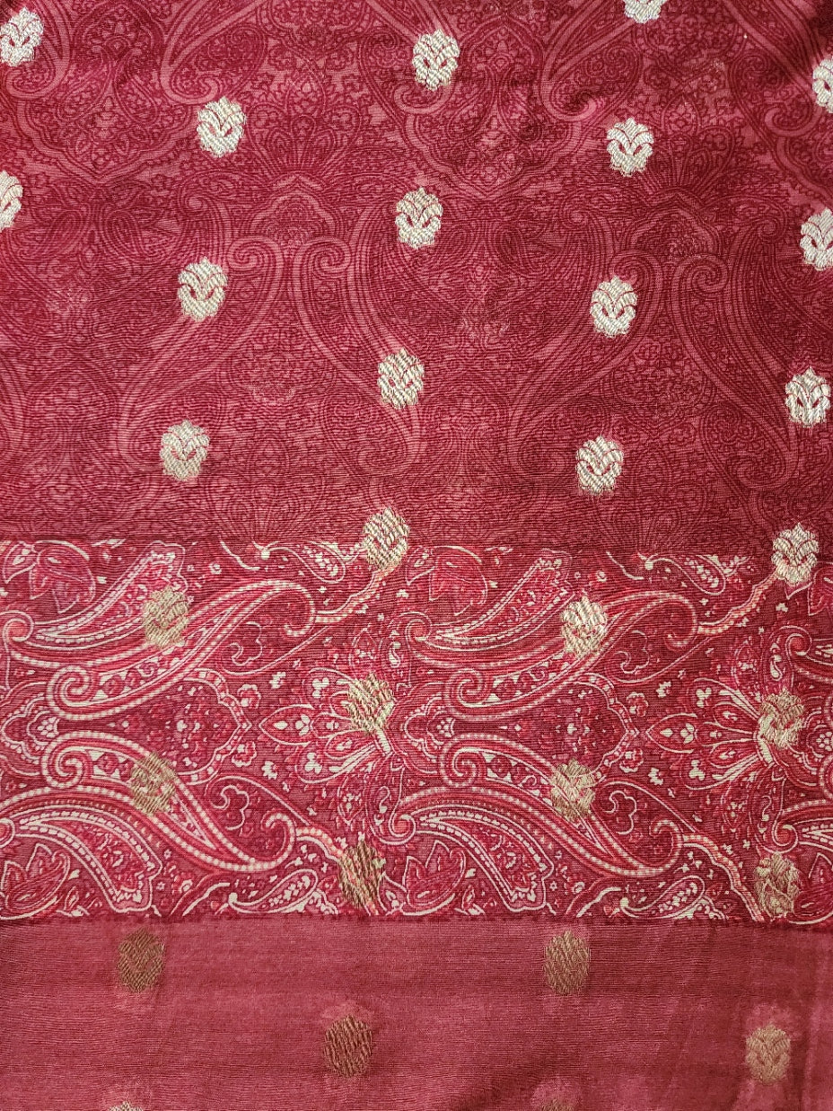 Elevate your wardrobe with this exquisite Maroon Red Munga Silk 3-piece Kurta Set, a perfect blend of sophistication and comfort. Crafted from luxurious Munga silk, known for its rich texture and natural sheen, this set brings timeless elegance to your collection. The kurta features intricate Zari buta detailing in both back & front of kurta fabric, adding a touch of traditional opulence.