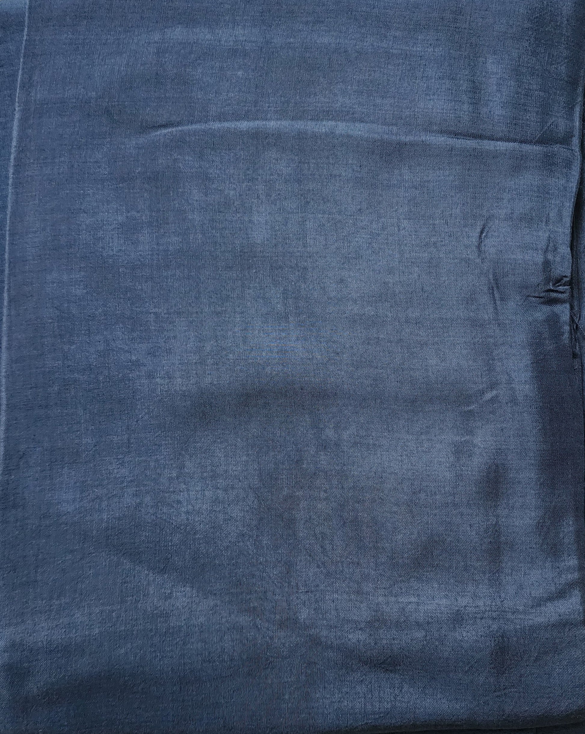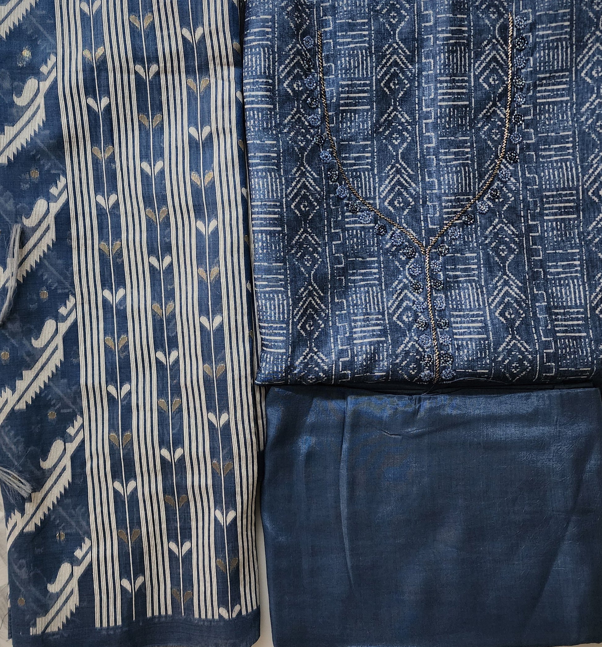 Indigo Blue Printed Kurta Set in Cotton Linen with Neckline Embroidery, Jamdani Dupatta & Shantoon Bottom