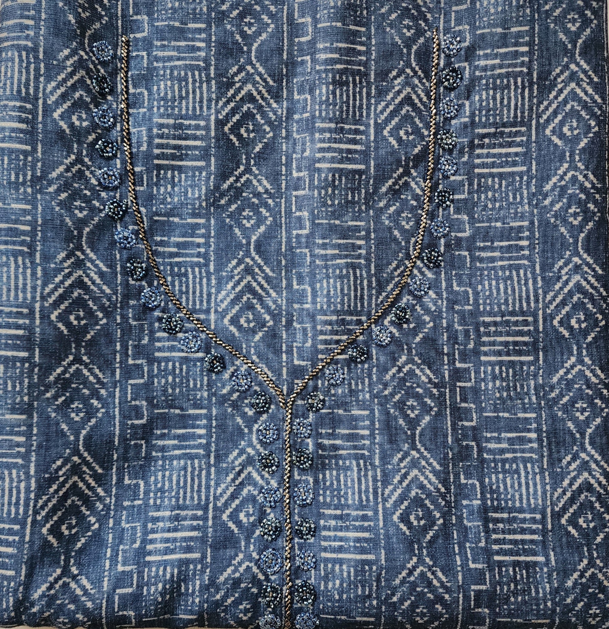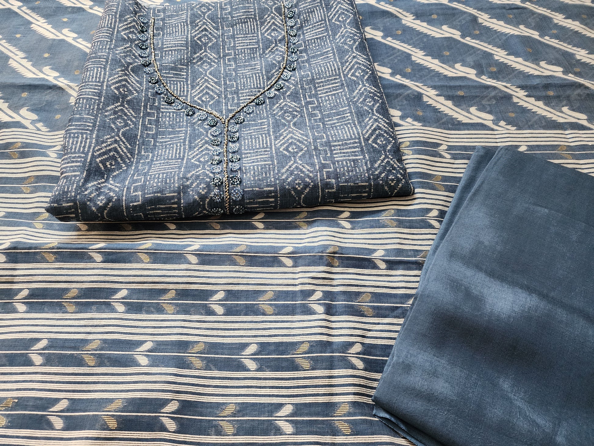Indigo Blue Printed Kurta Set In Cotton Linen With Neckline Embroidery, Jamdani Dupatta & Shantoon Bottom