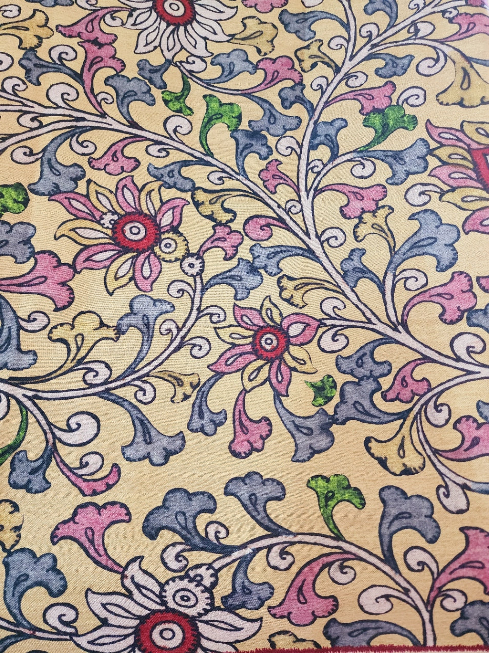 - A unique fusion of Kalamkari hand-painted prints and Patola-inspired borders