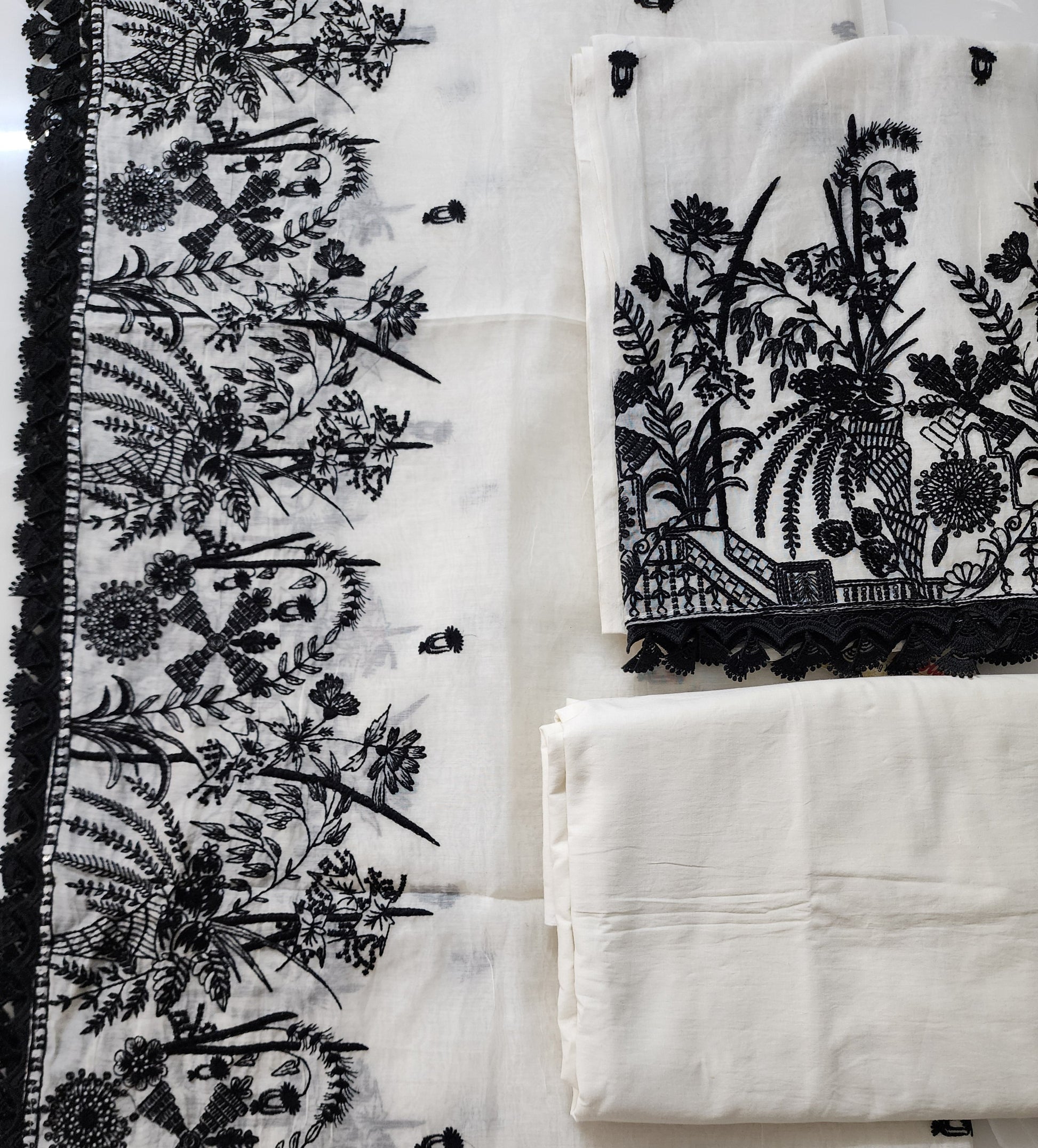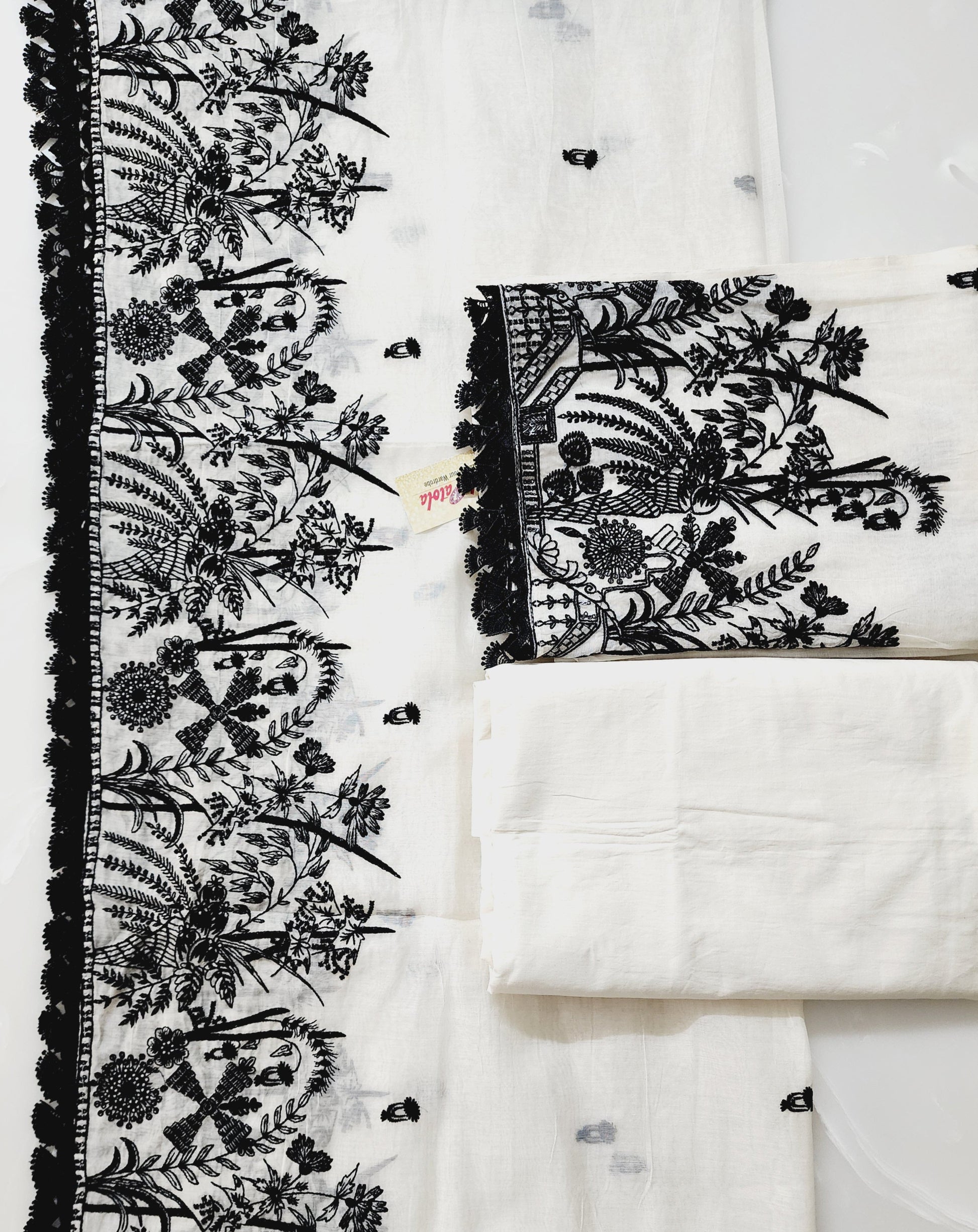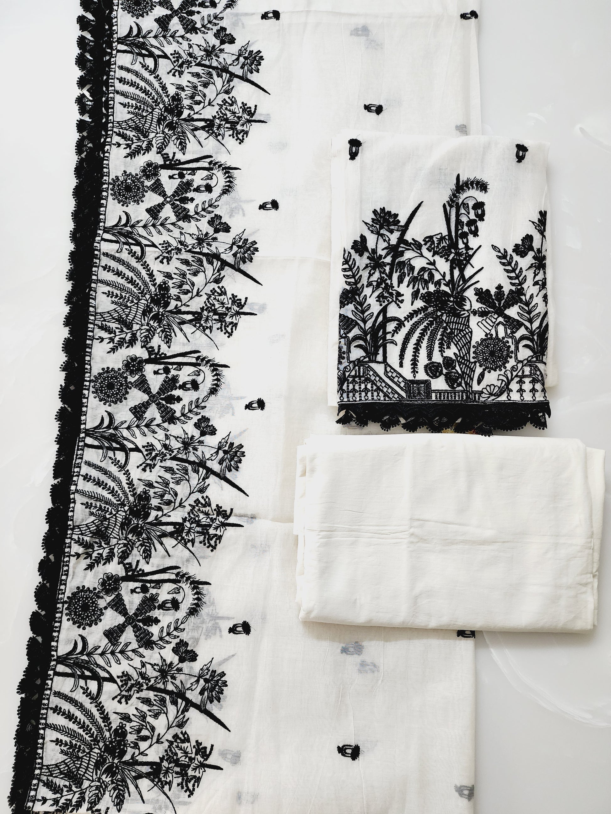 The set includes a matching pure cotton bottom with a breathable and lightweight feel, enhanced with extra lining fabric for added comfort and modesty. The coordinating Mul cotton dupatta is gracefully adorned with lace work that adds an ethereal touch, tying the entire look together with effortless grace.