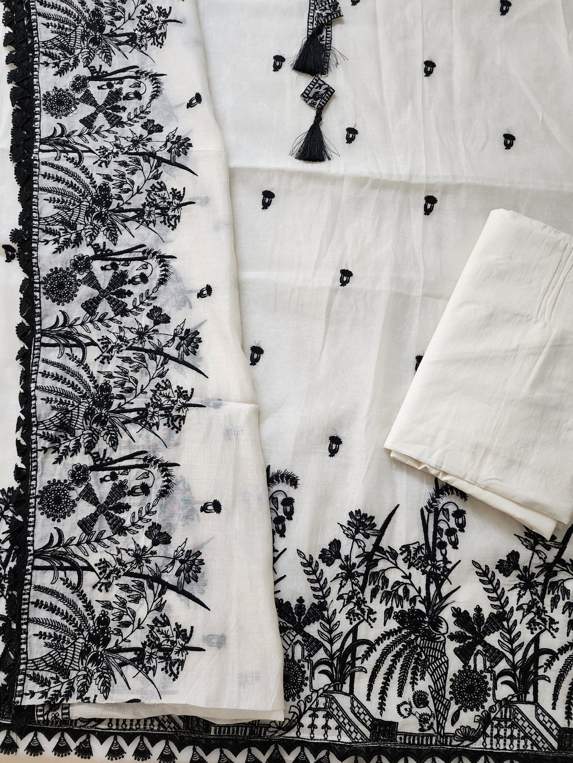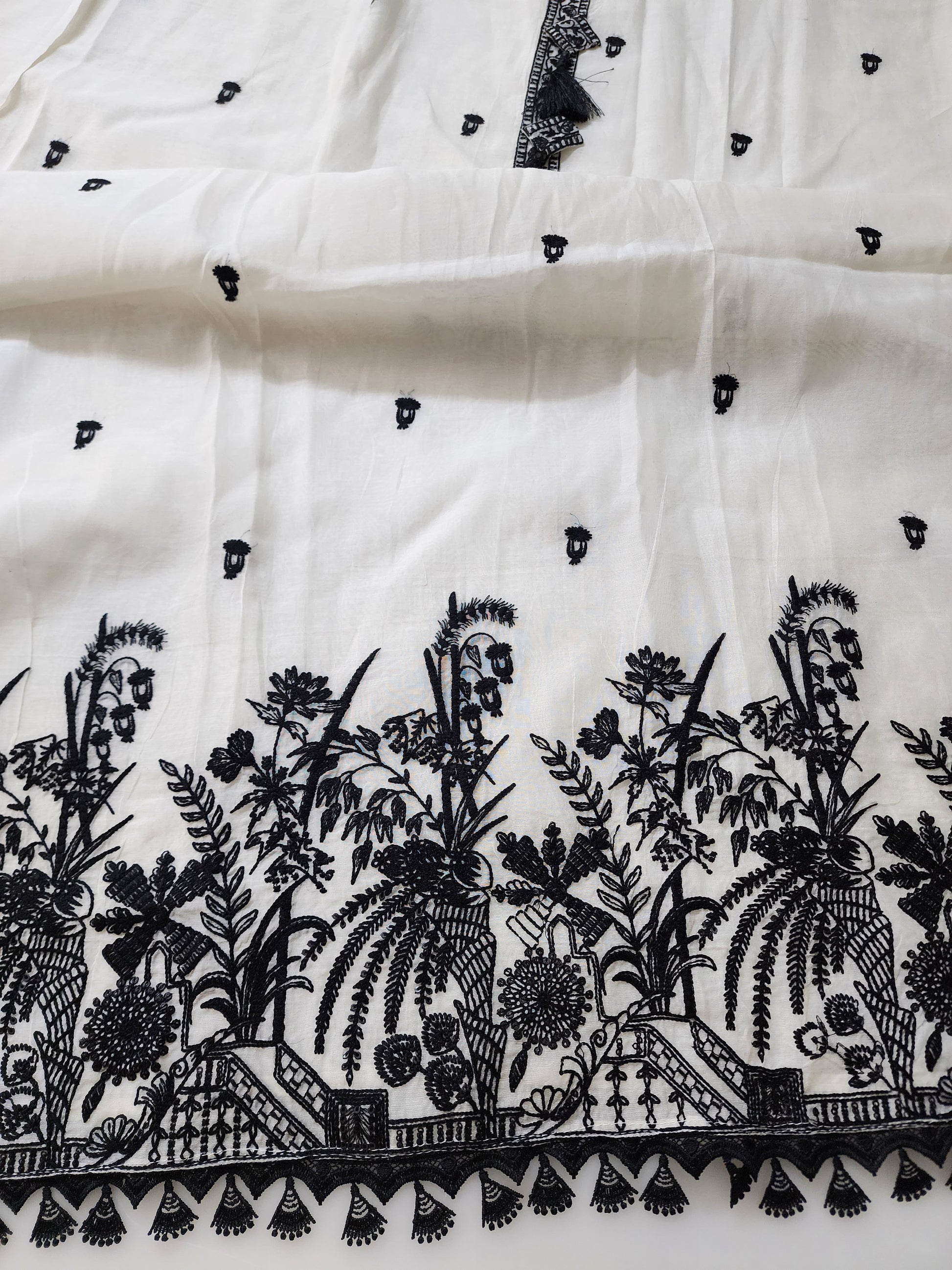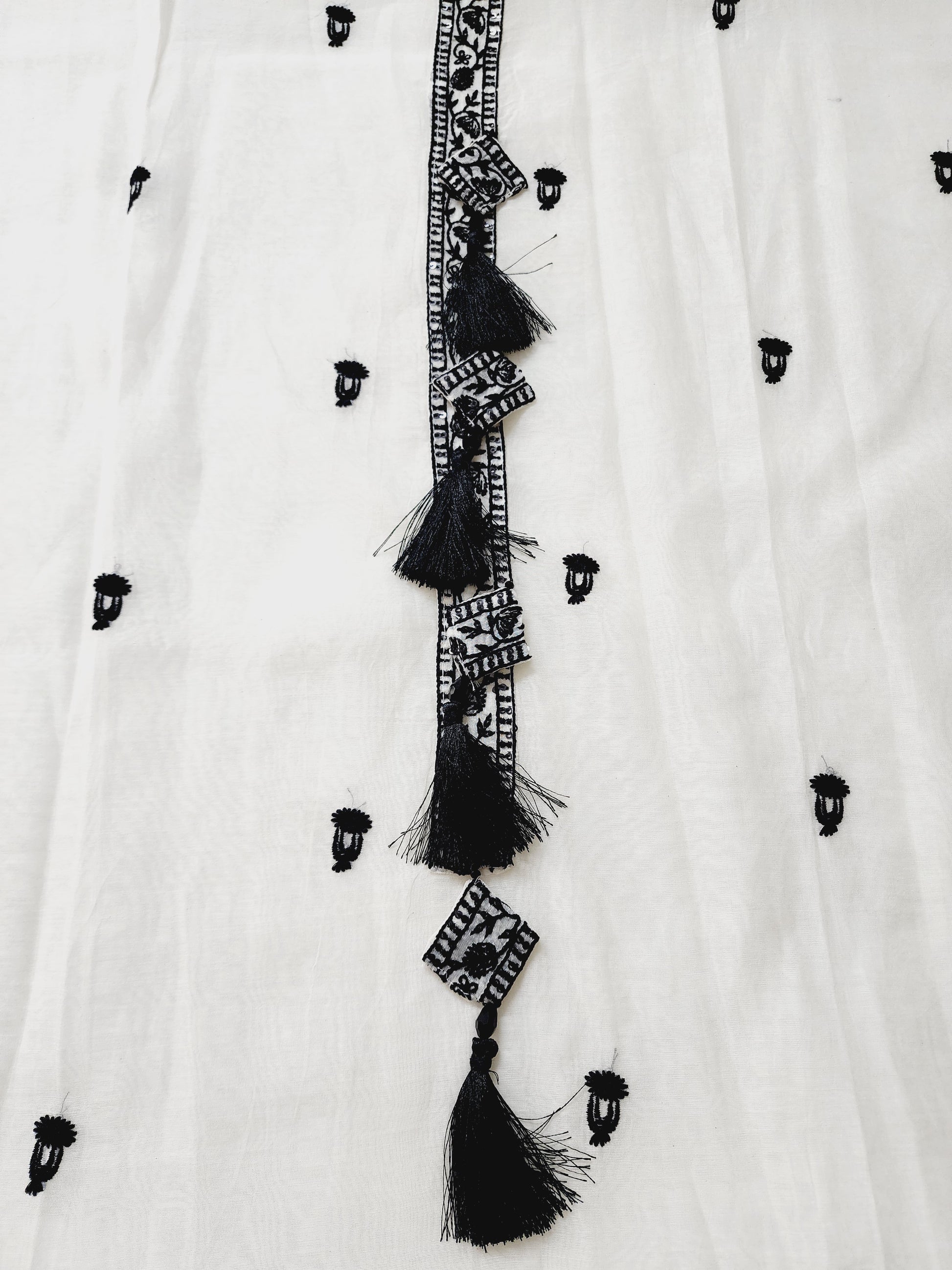 Offwhite & Black Embroidered Mul Cotton Kurta Set With Tassels & Lace Work