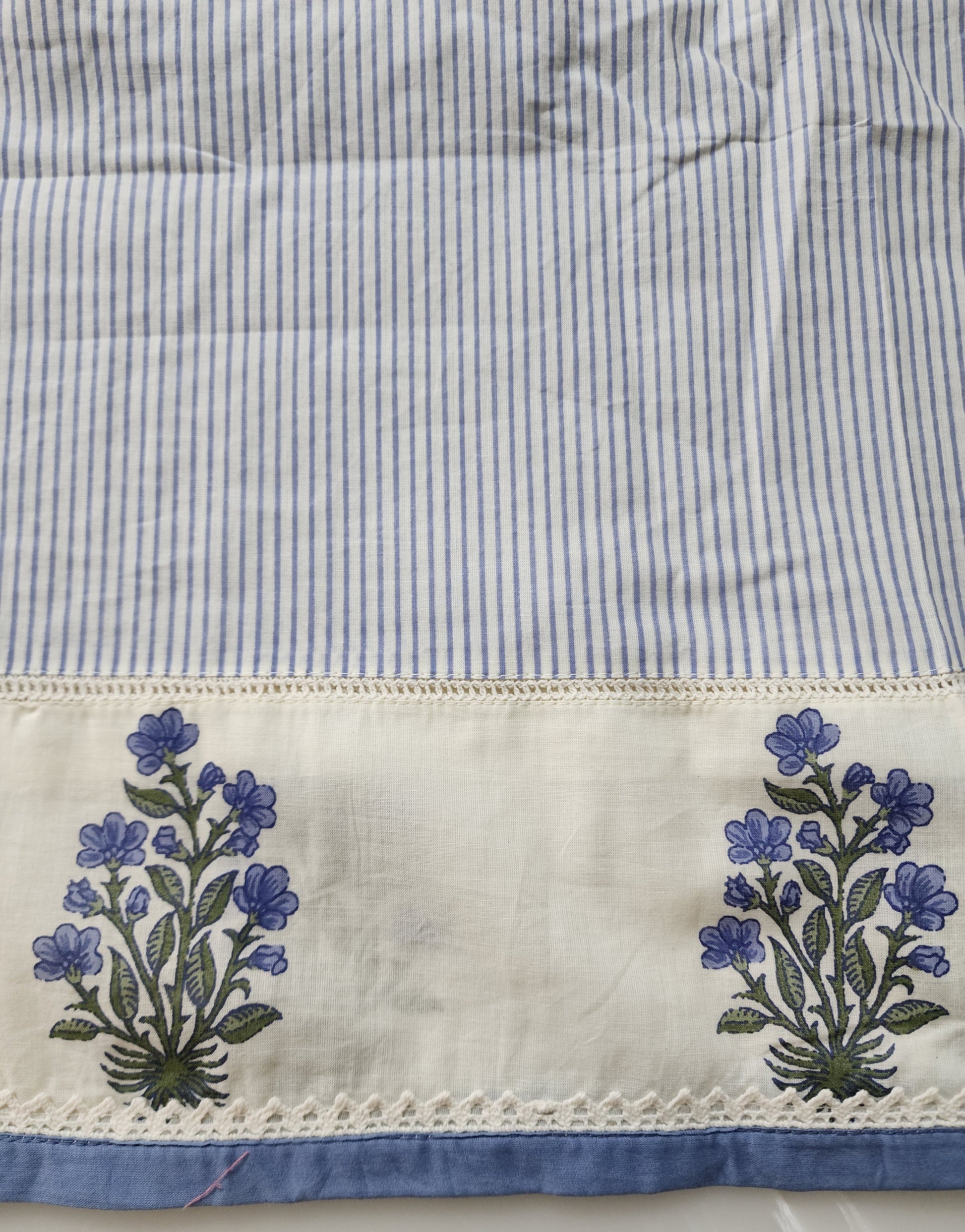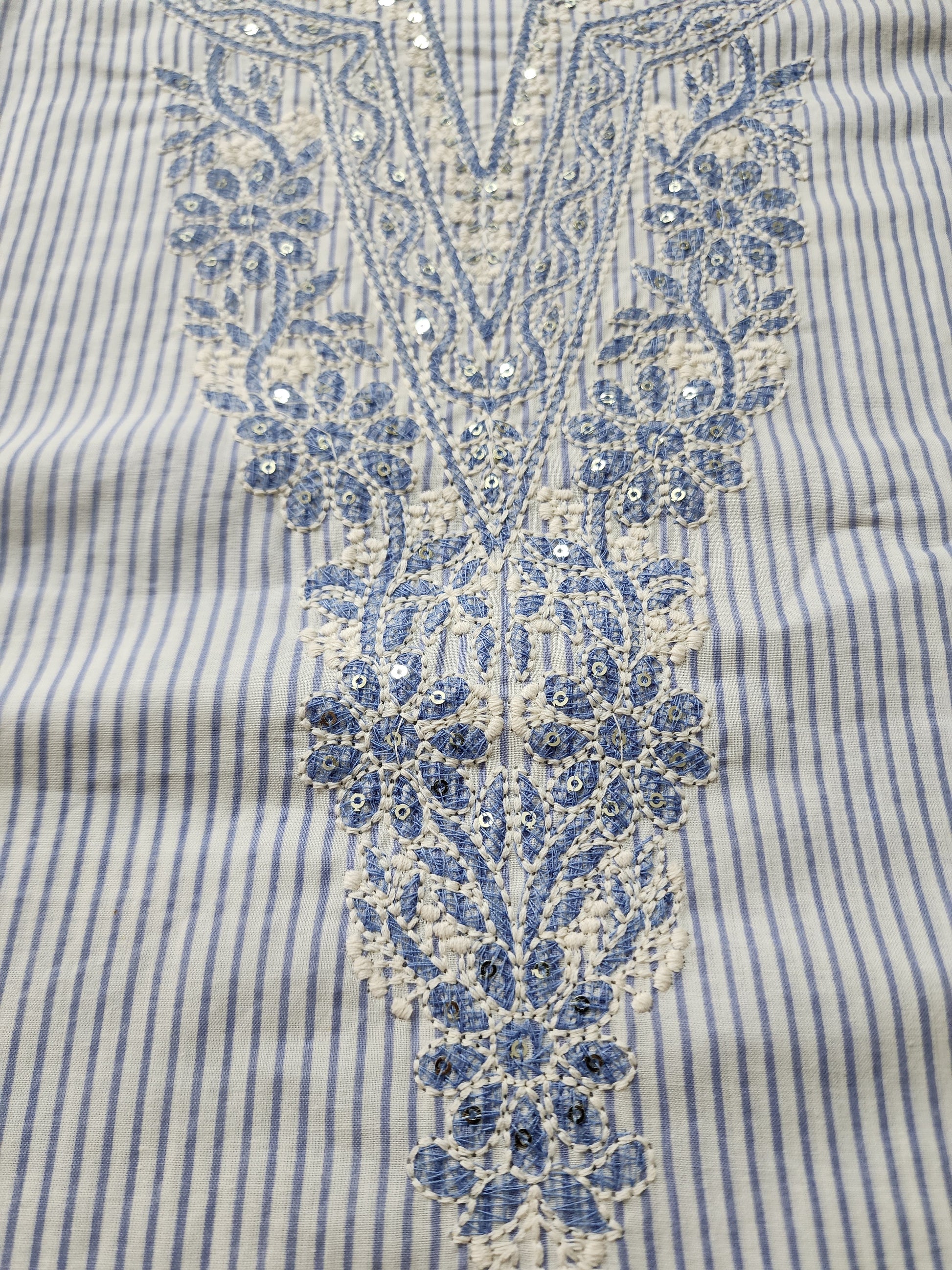 Effortlessly elegant and rooted in tradition, this Offwhite & Blue Striped Cotton Kurta Set is a timeless addition to your everyday ethnicwear wardrobe. Crafted from breathable cotton, the kurta features subtle vertical stripes that elongate the silhouette, complemented by delicate embroidery on the neckline and handblocked border at the hem—adding just the right touch of handcrafted charm.
