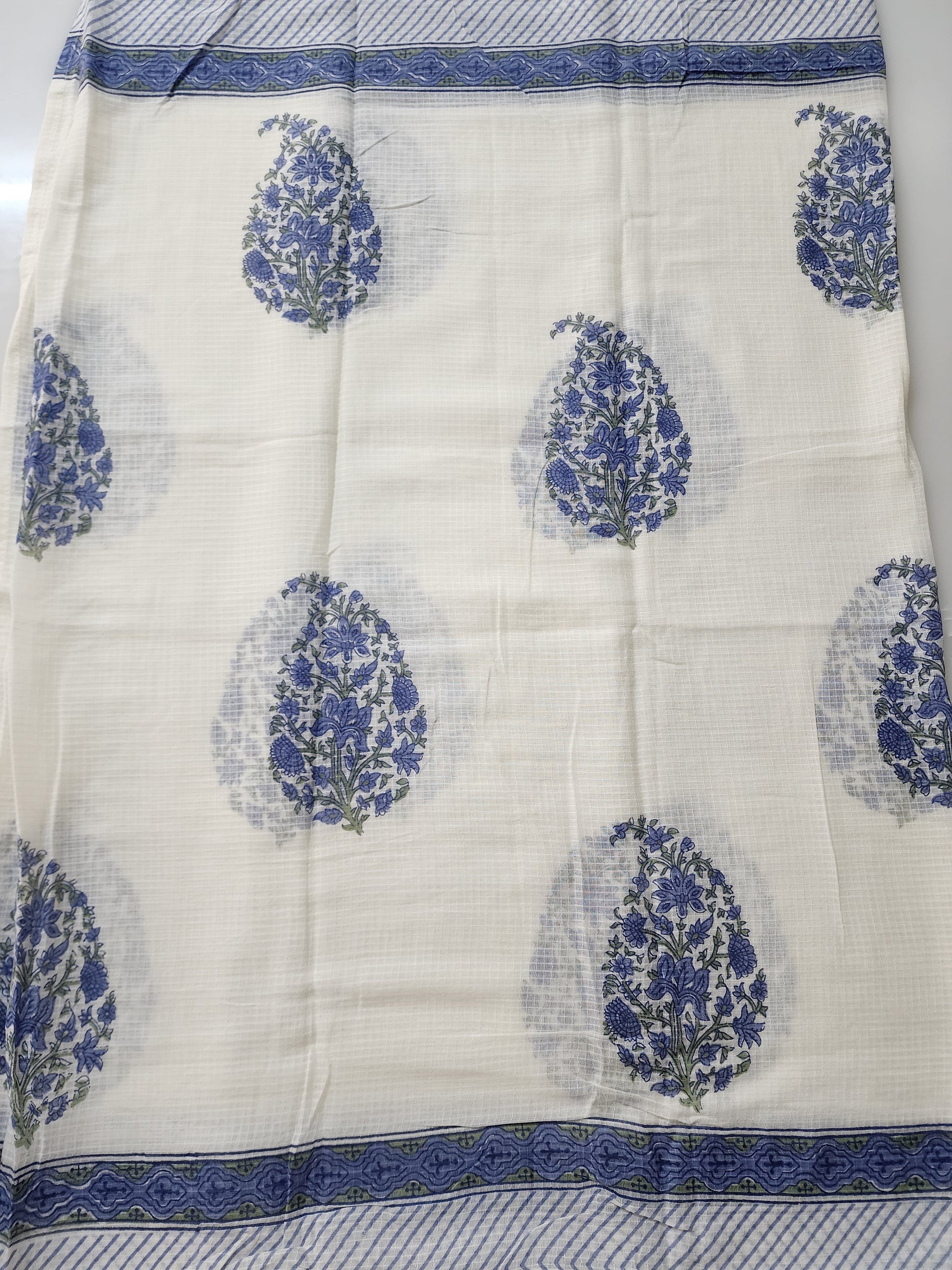 Offwhite & Blue Striped Cotton Kurta Set With Embroidery & Handblocked Dupatta