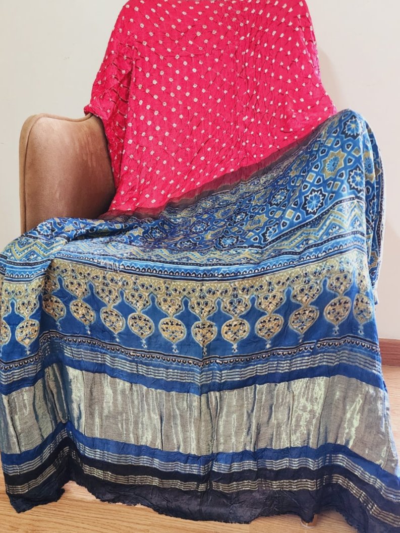 The unique combination of Bandhani and Ajrak techniques highlights the artistry and craftsmanship of Indian textiles, making this dupatta not just an accessory, but a statement piece. The lightweight modal silk drapes gracefully, ensuring comfort while exuding sophistication, perfect for both casual outings and festive occasions.