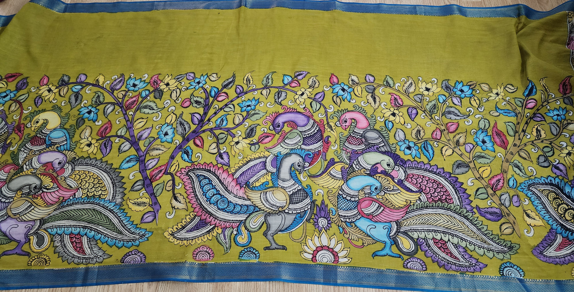 Bright Green Hand-Painted Kalamkari Cotton Dupatta with Multicolor Peacock Motifs & Zari Border