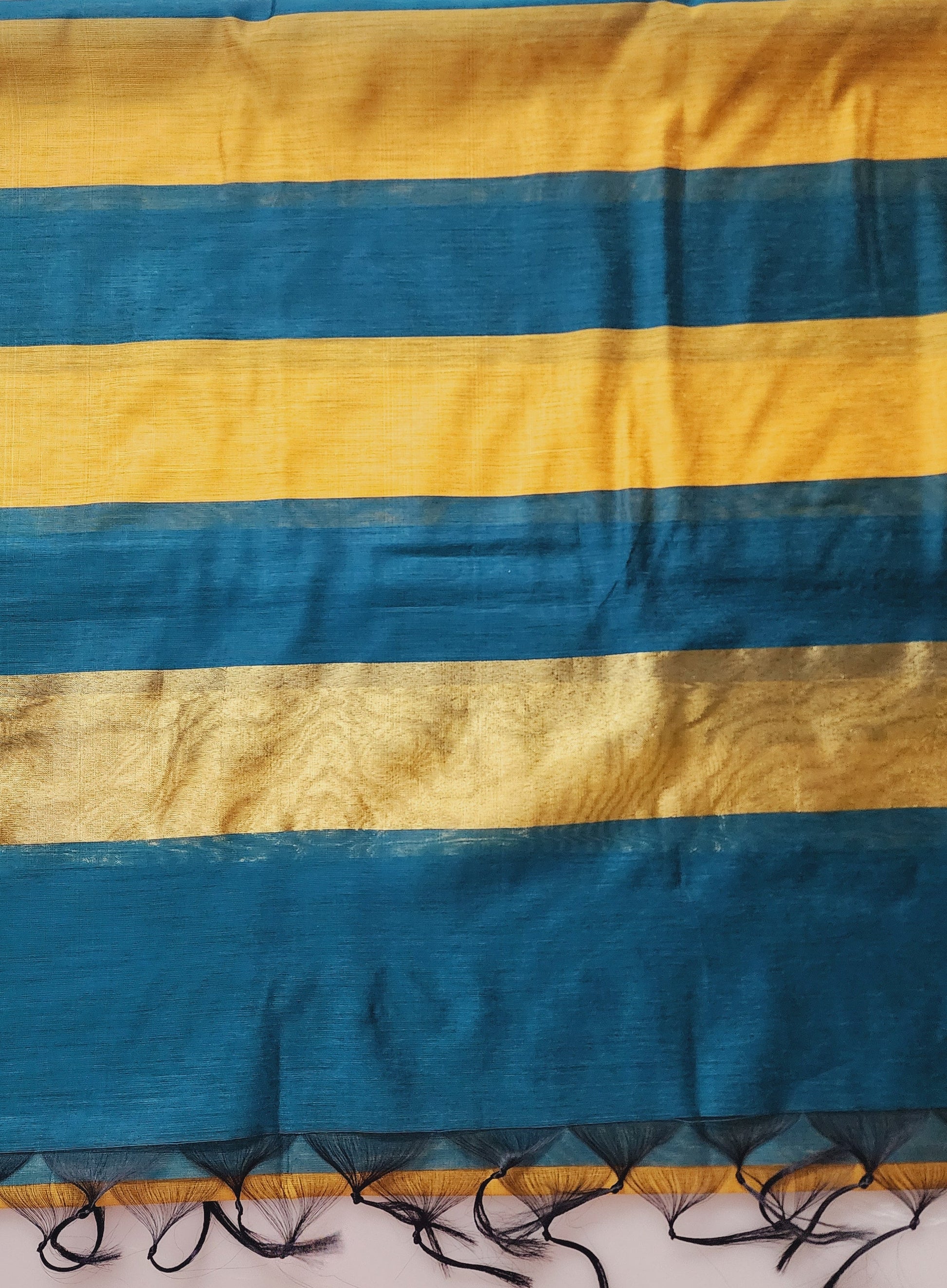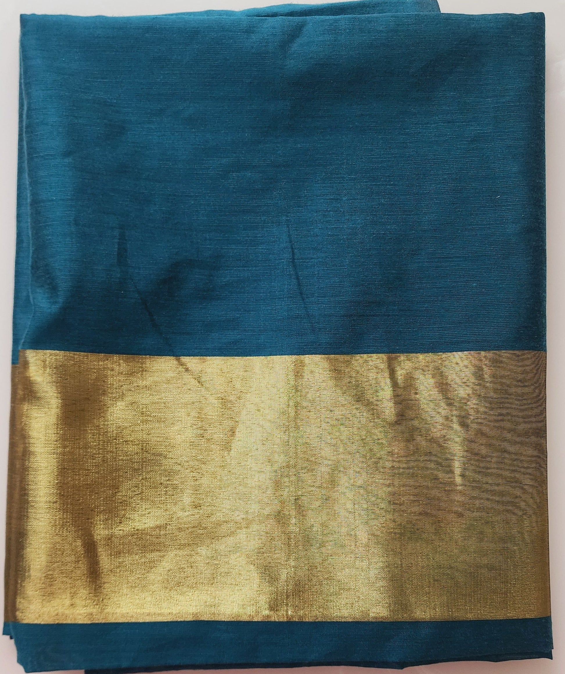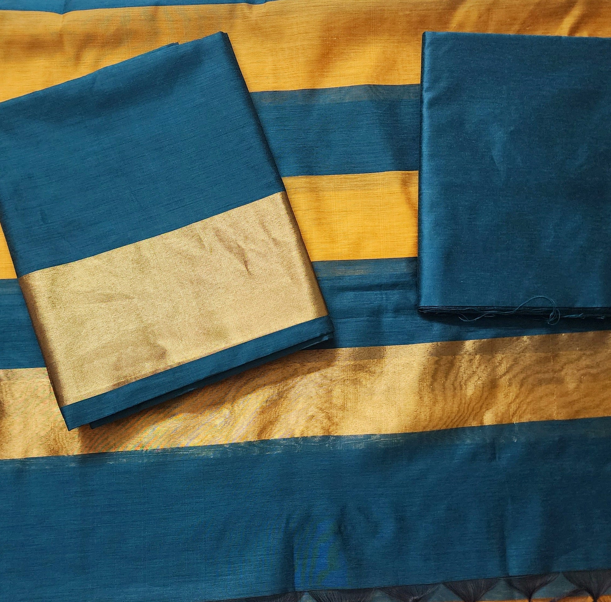 Teal & Mustard Yellow Unstitched Chanderi Cotton Kurta Set with Golden Zari Border