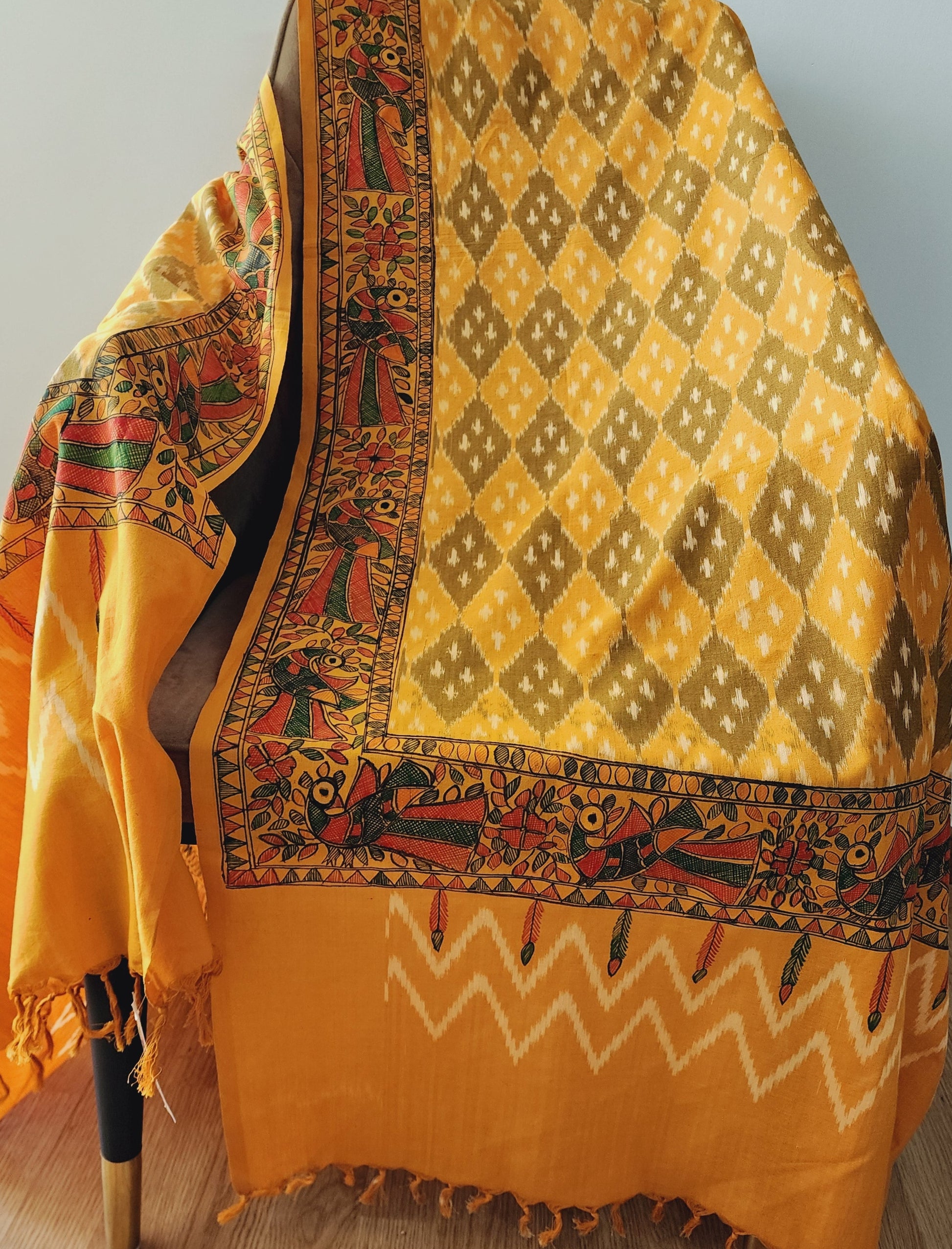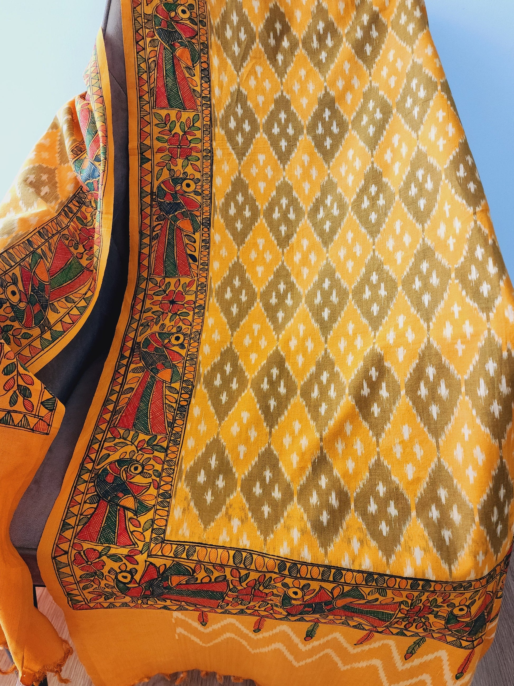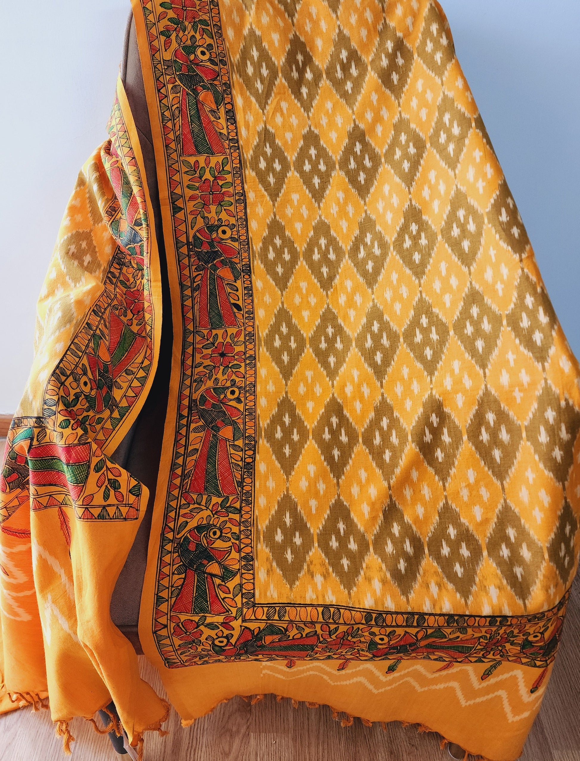 Yellow Ikat & Madhubani Fusion Cotton Dupatta