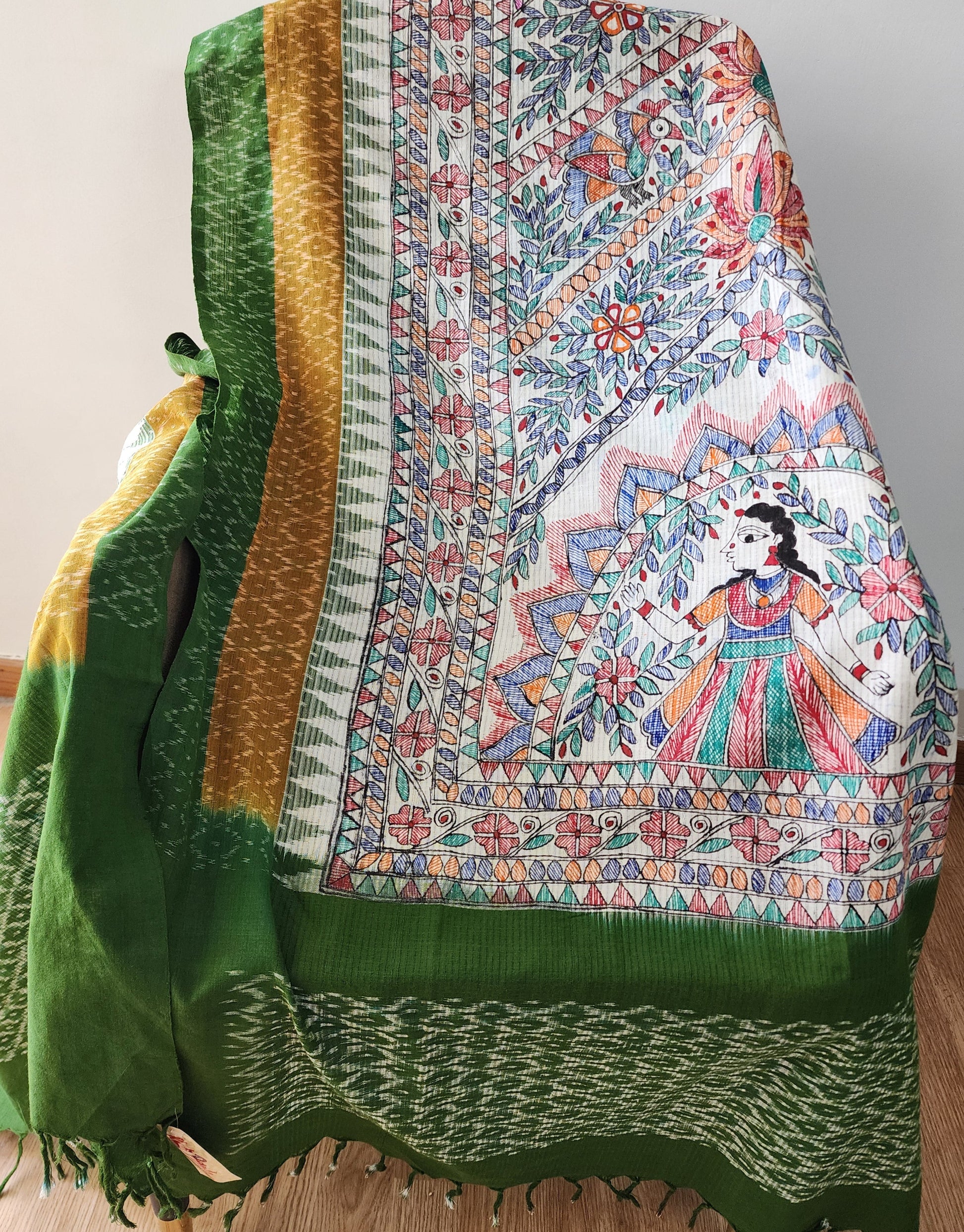 The combination of beige and green dupatta offers a cheerful pop of color, while the bold Ikat patterns and beautifully detailed Madhubani motifs create a striking visual contrast. This versatile piece is perfect for elevating any outfit, whether you're pairing it with a simple kurta for a casual day out or using it to add a dash of color to a more formal look.